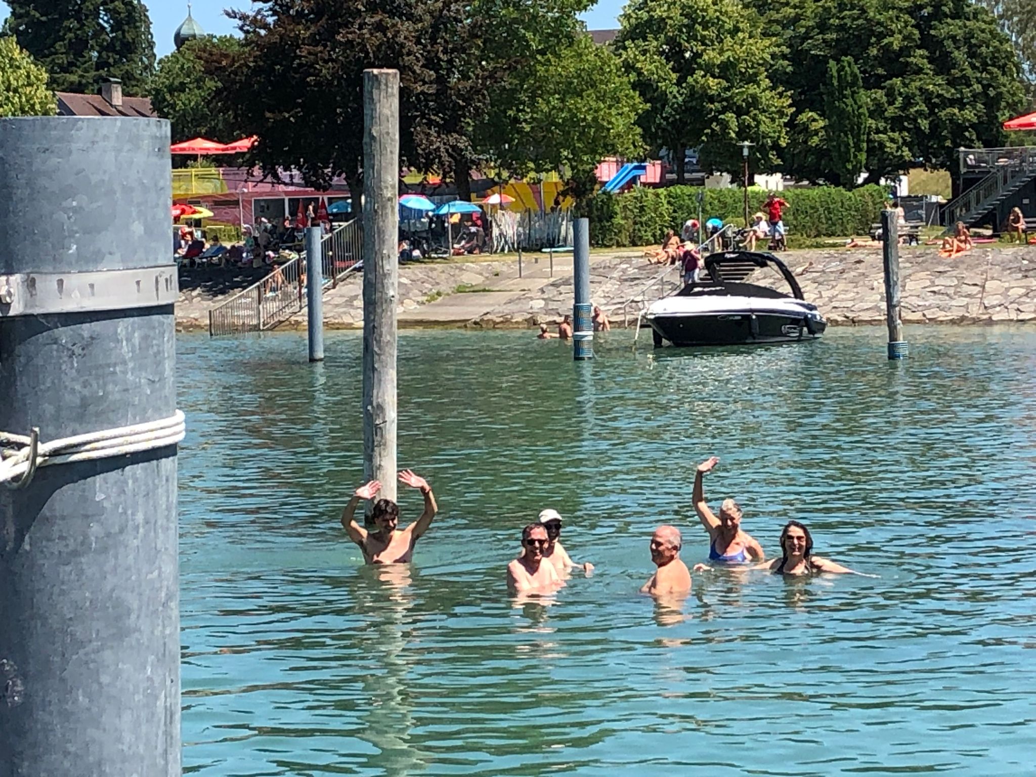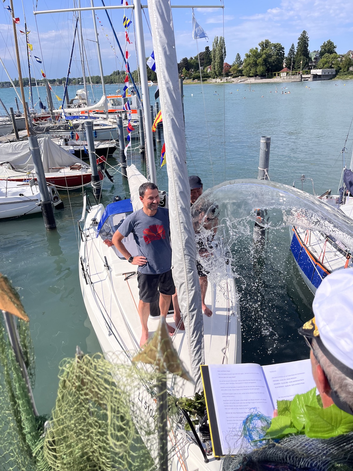 Dank der hervorragenden Organisation konnten wir dann zwischen Regatta und Bootstaufe gemütlich das erste Fass Bier trinken, das von den Täuflingen gespendet worden war, bevor am späteren Nachmittag die drei Täufling-Crews sich über das erfrischende Nass von Neptun, Klabautermann und Sirene in Gestalt von Christian Hogemüller, Tim Würfel und Marina Du Val freuen durften. Viele nutzten die Zeit auch noch, um sich im Hafen abzukühlen – sollte der Wasserstand auch in den nächsten Jahren so niedrig bleiben, wäre eine kleine Bar am Dalben gar keine schlechte Idee!