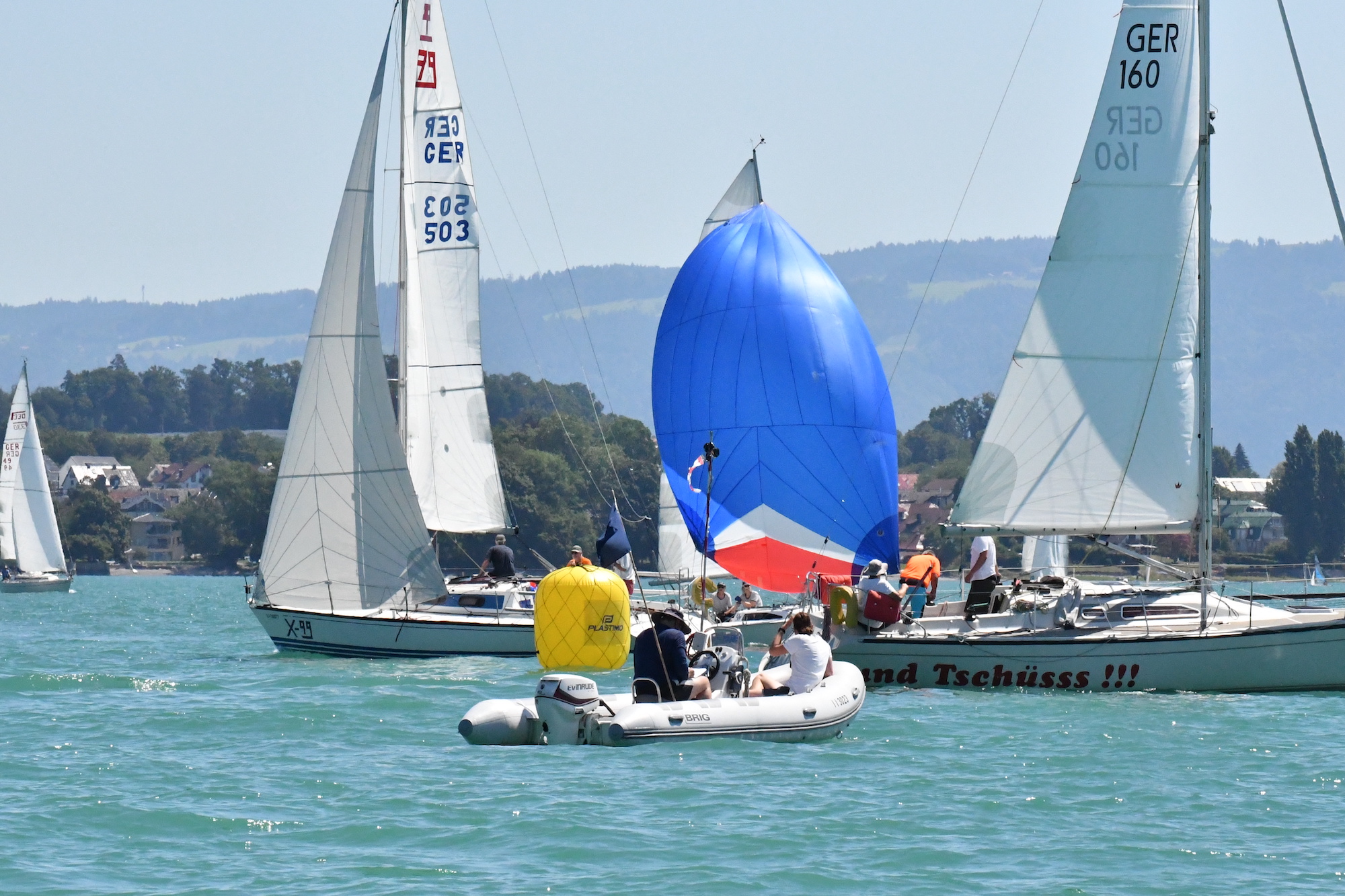 Die Nonnenstein I mit 20 Teilnehmern konnte dank passendem Wind schnell gesegelt werden, allerdings gab es durchaus Schwierigkeiten, weil einigen Booten die richtige Reihenfolge der Bahnen dann doch nicht mehr klar war. Zwischenzeitlich trieb dann auch eine der Tonnen ab und sorgte für zusätzliche Verwirrung. Aber vielleicht auch wegen der Hitze war der Kampfgeist bei einigen groß. Beim Kampf an der Luv-Tonne wurden Regeln wie Wind von Steuerbord oder Raum zur Tonne großzügig gehandhabt…