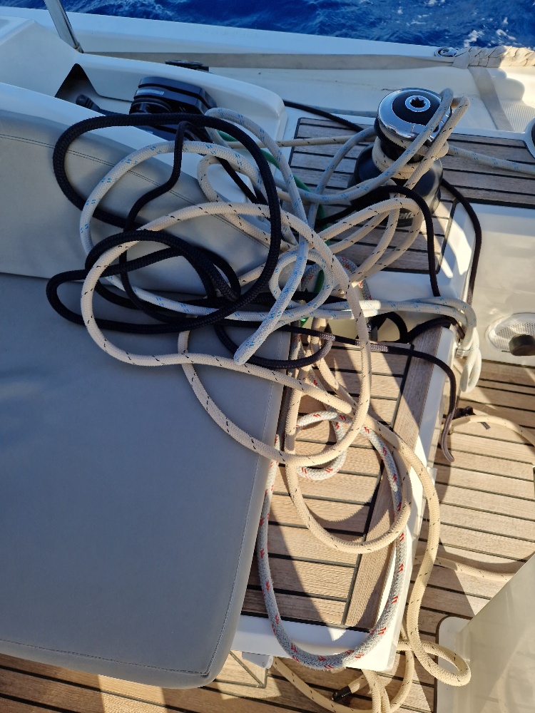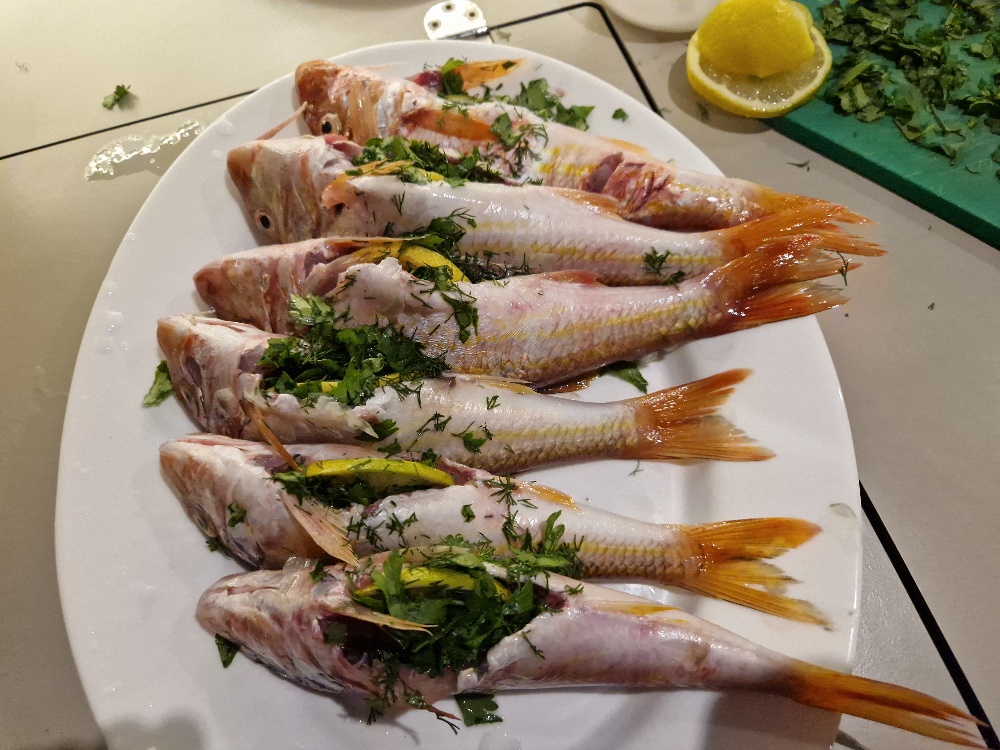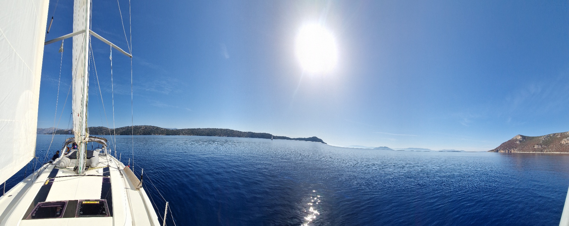 So wurde eine Woche lang zumeist gemächlich vorwärts geschaukelt. Lediglich vor Porto Leone (Kalamos) mit seinem malerischen verlassenen Dorf brachten Windböen bis Stärke 5 die Boote kurzzeitig in Schräglage… und die Segler zum genüsslichen Grinsen. Mal hieß es ankern in einer Bucht, mal festmachen in einem kleinen Hafen. Mal ging es am Nachmittag auf Landausflug, mal abends in eine Taverne. Oder es wurden bei einem Fischer erstandene rote Meerbarben in der winzigen Bordküche gebraten.