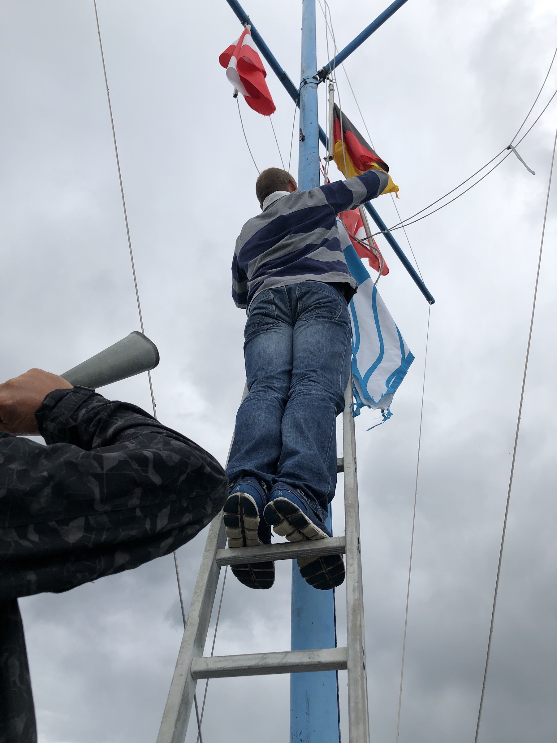 Dennoch wurde – stellvertretend für alle, die nicht informiert waren oder nicht da sein konnten - traditionsgemäß die Leiter an den Flaggenmast gerückt und der Stander eingeholt. Das Tröten der Notsignal-Hörner schallte kaum weniger laut als in coronafreien Jahren über die Boote im Hafen hinweg.