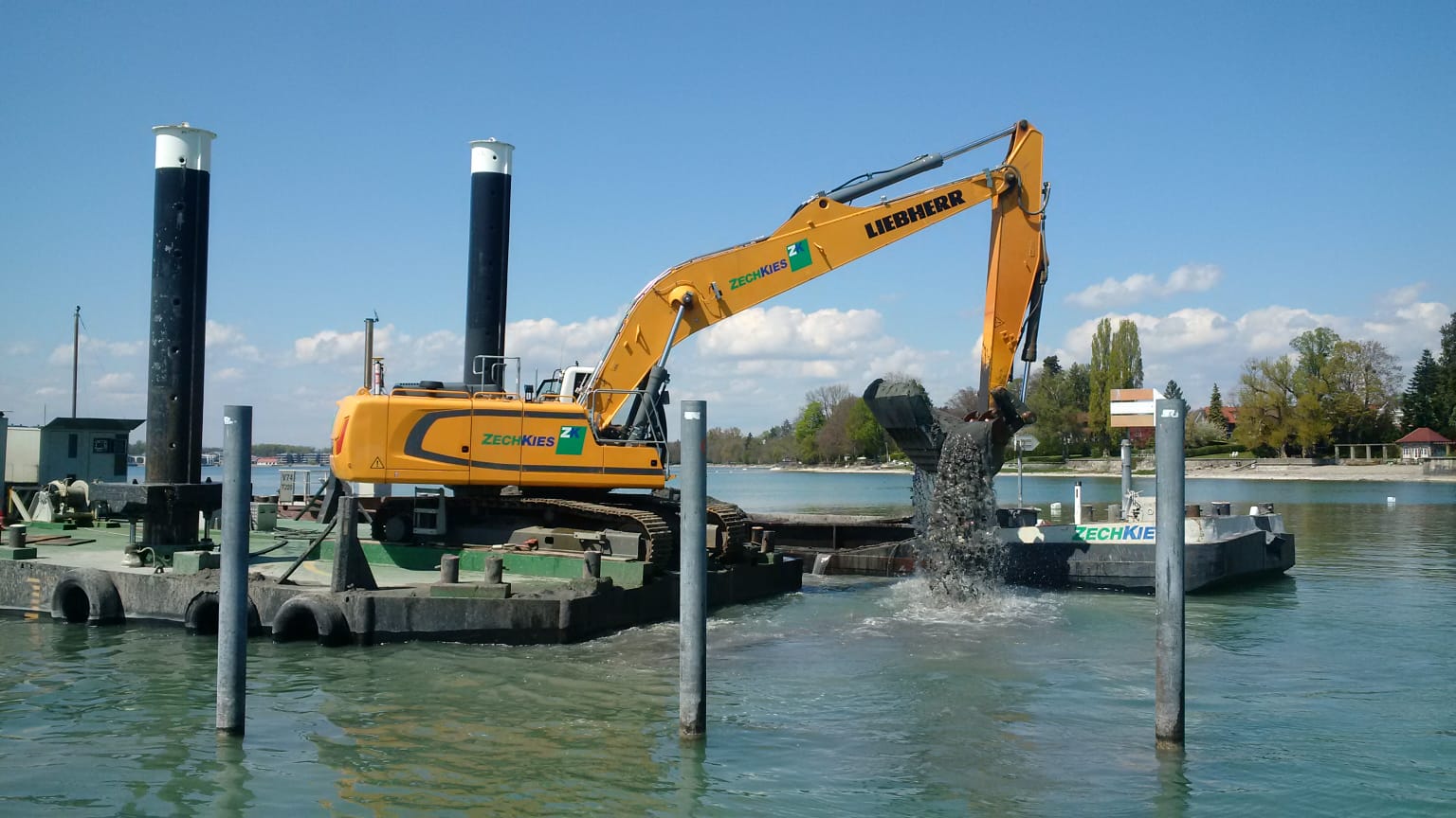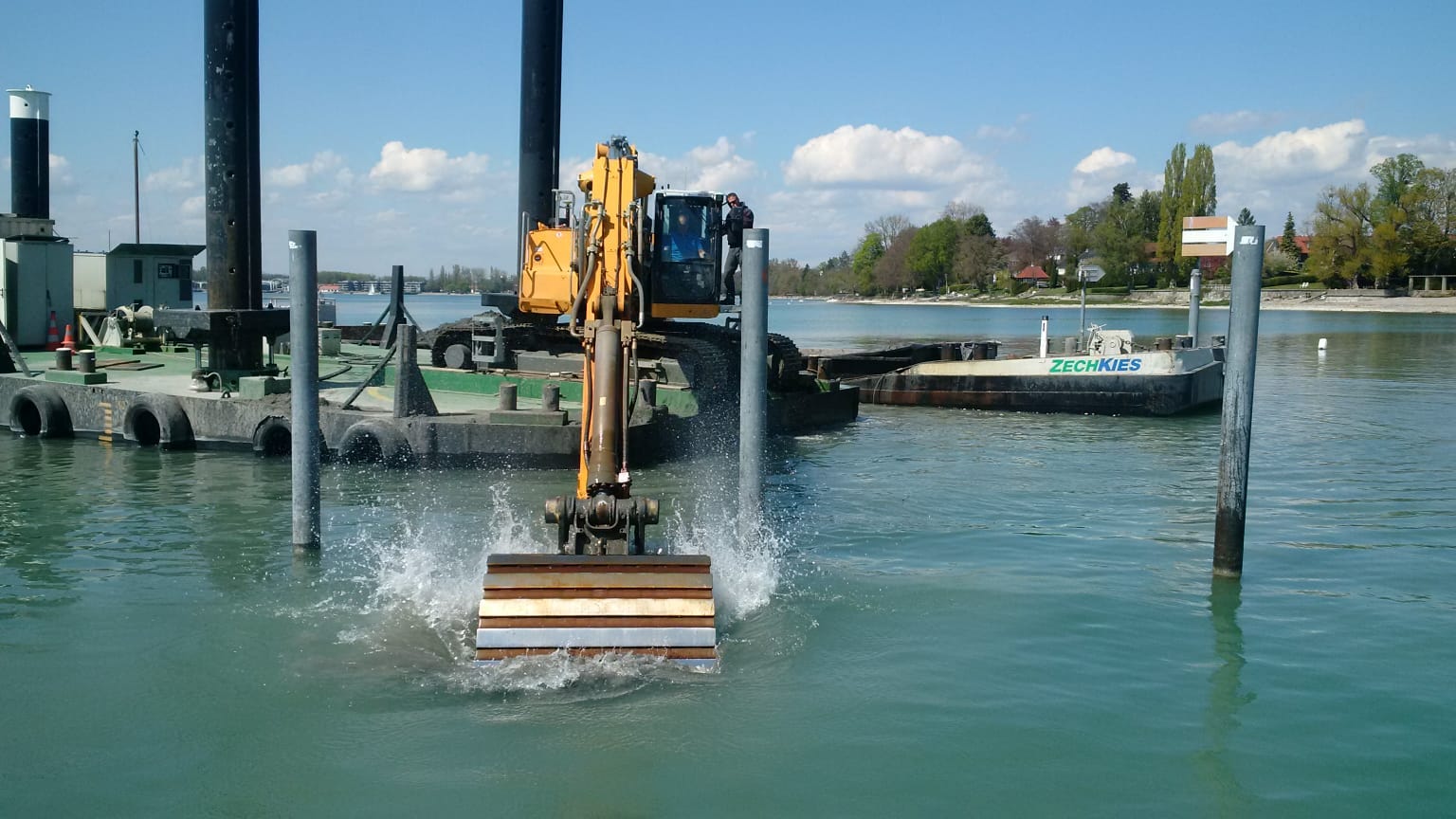 Im Hafenbecken haben sich in diesem Frühjahr erneut Schaufel-Zähne in den Seegrund gegraben. Das Ausbaggern, das in der Karwoche 2020 nicht abgeschlossen werden konnte, wurde am 3. und 4. Mai 2021 fortgesetzt – mit neuer Genehmigung der Behörden. Die Firma Zechkies hat etwa 900 Kubikmeter Sand vor allem landseitig des Schwimmstegs abgetragen. Das dient auch dazu, dass die Wasserwacht den Liegeplatz ihres Bootes selbst bei niedrigem Wasserstand für Einsätze jederzeit verlassen kann.
