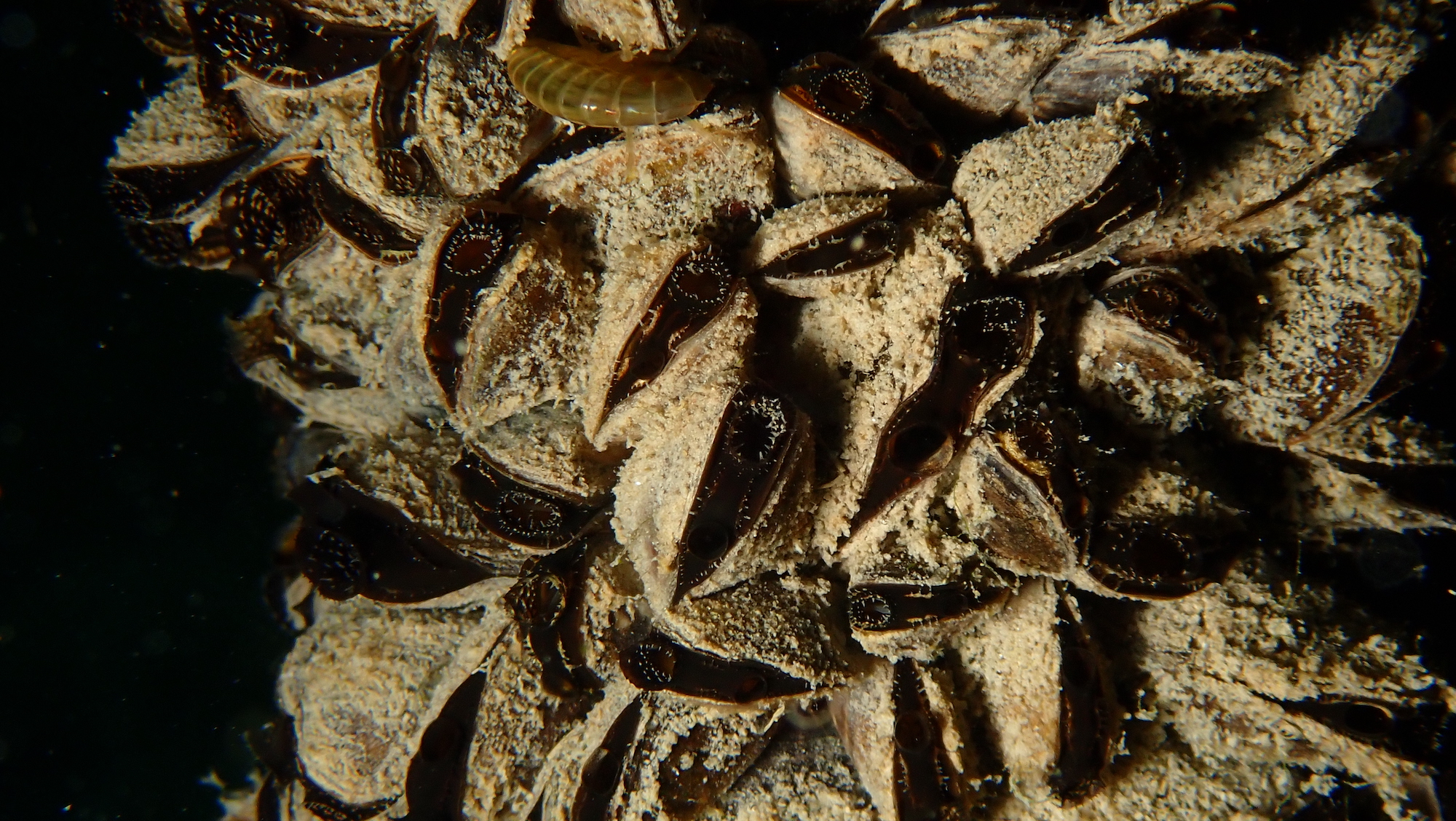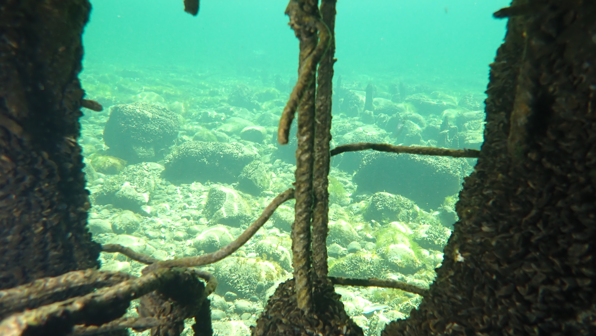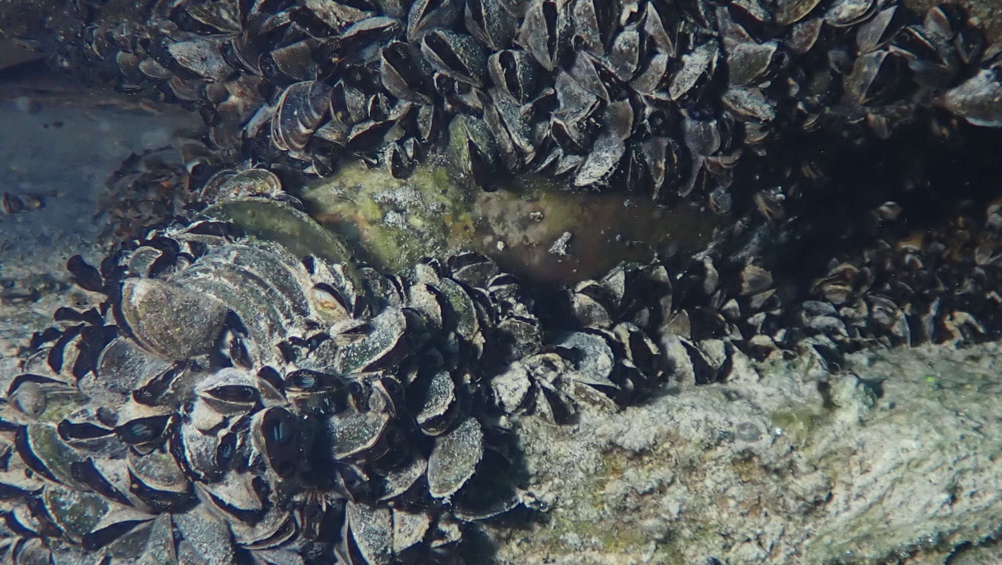 Irgendwann ist eine PET-Flasche in den See gefallen. Die Quaggamuscheln, auch nicht heimisch, haben sie mit Beschlag belegt.