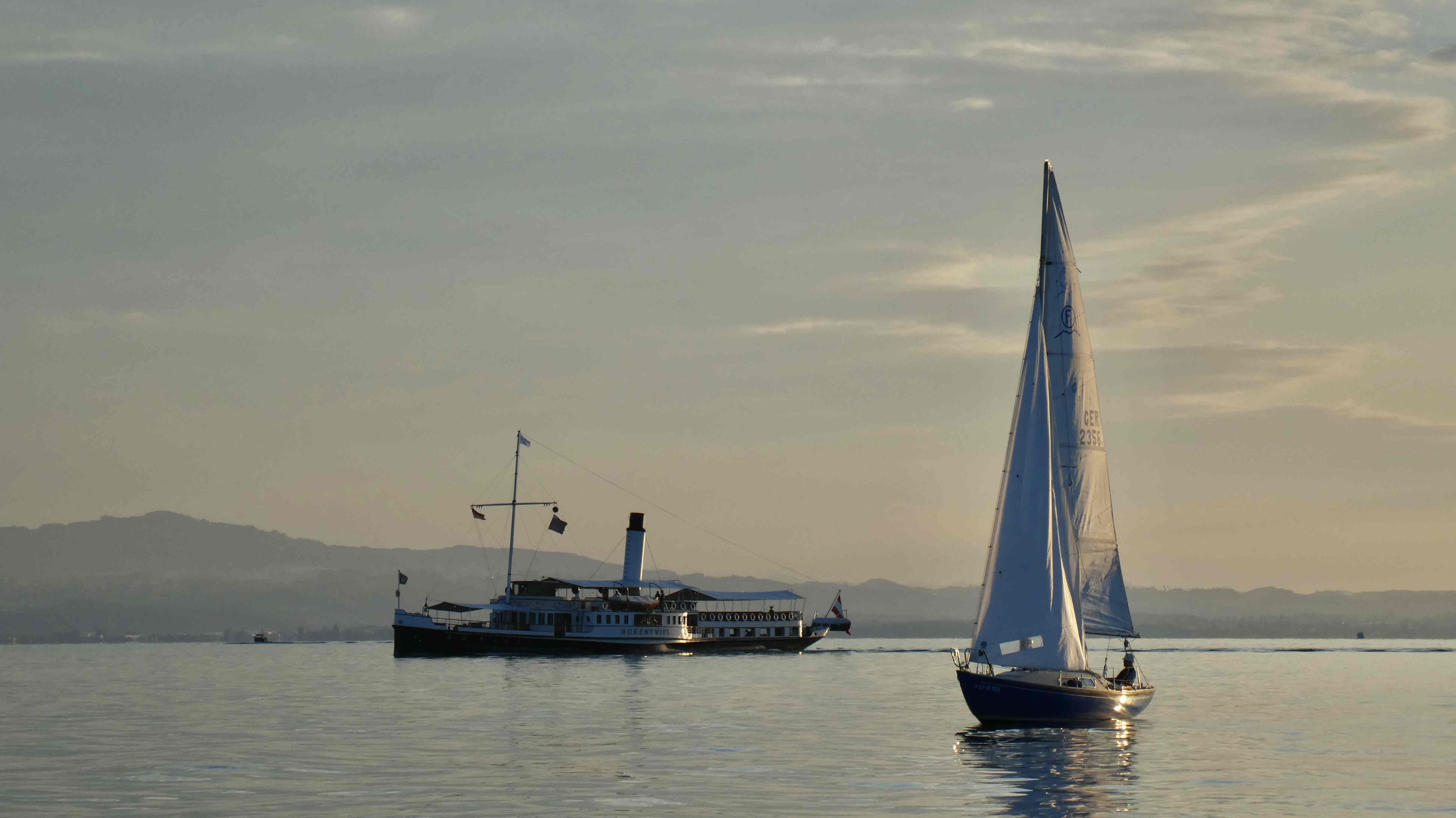 In diesem Jahr gab es wegen der großen Nachfrage 13 Feierabendsegeln-Termine im Juni, Juli und August, mehr als in den vergangenen Jahren. Nur dreimal war das Wetter zu schlecht oder der Wind zu heftig, um hinauszugehen. Selbst wenig Wind oder nahezu Flaute schreckte die Segelbegeisterten nicht. Belohnt wurden sie meist mit spektakulären Sonnenuntergängen auf dem Wasser und fröhlichem Geplauder an Bord. Einmal zog sogar die „Hohentwiel“ für ein Foto vorbei.