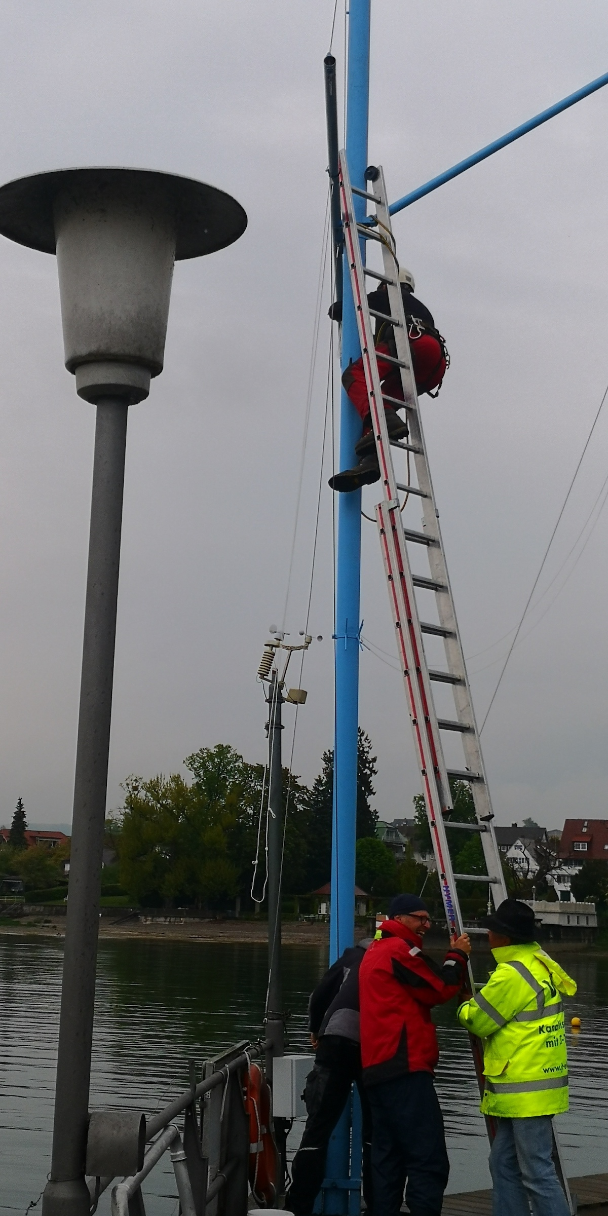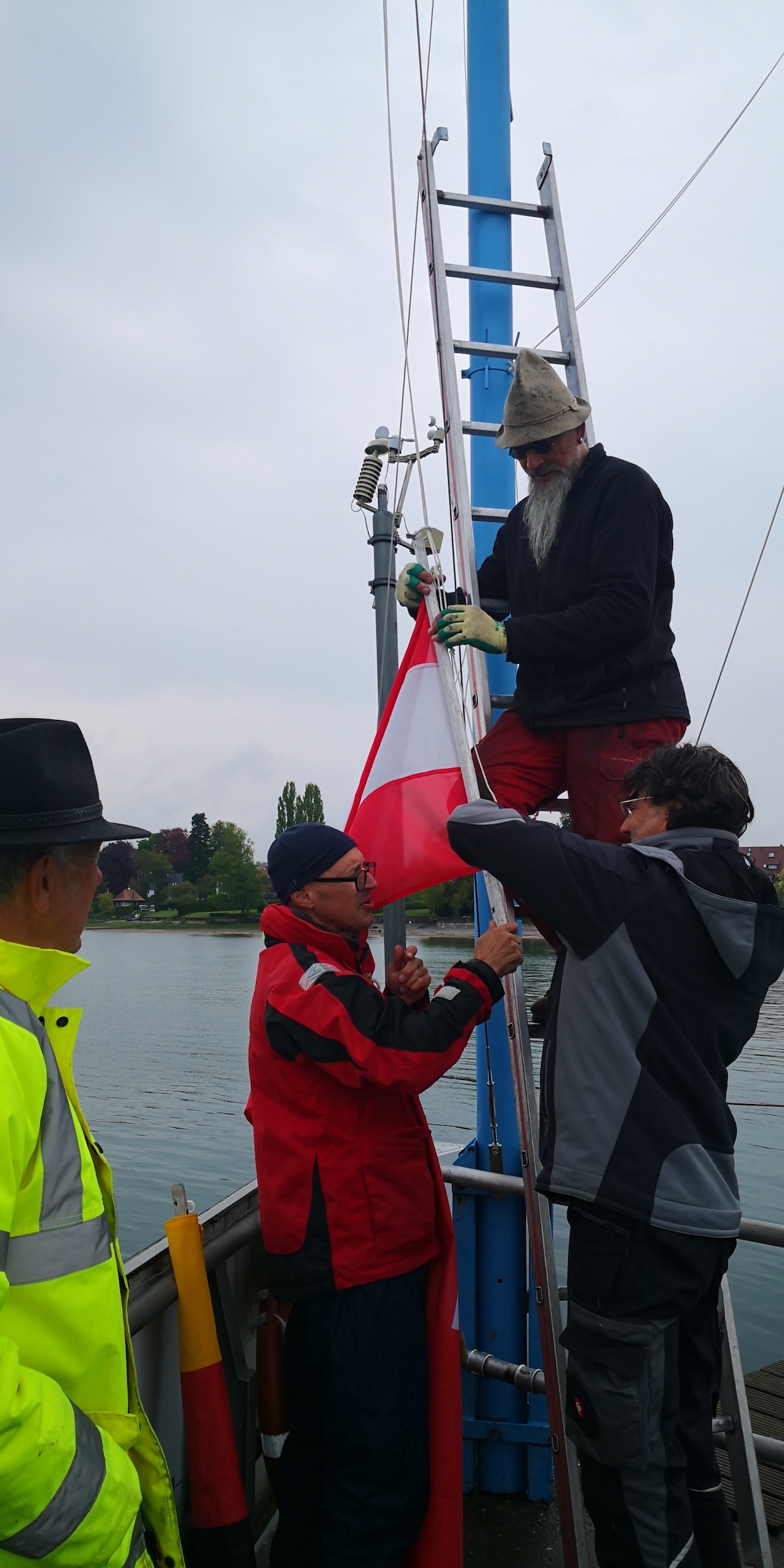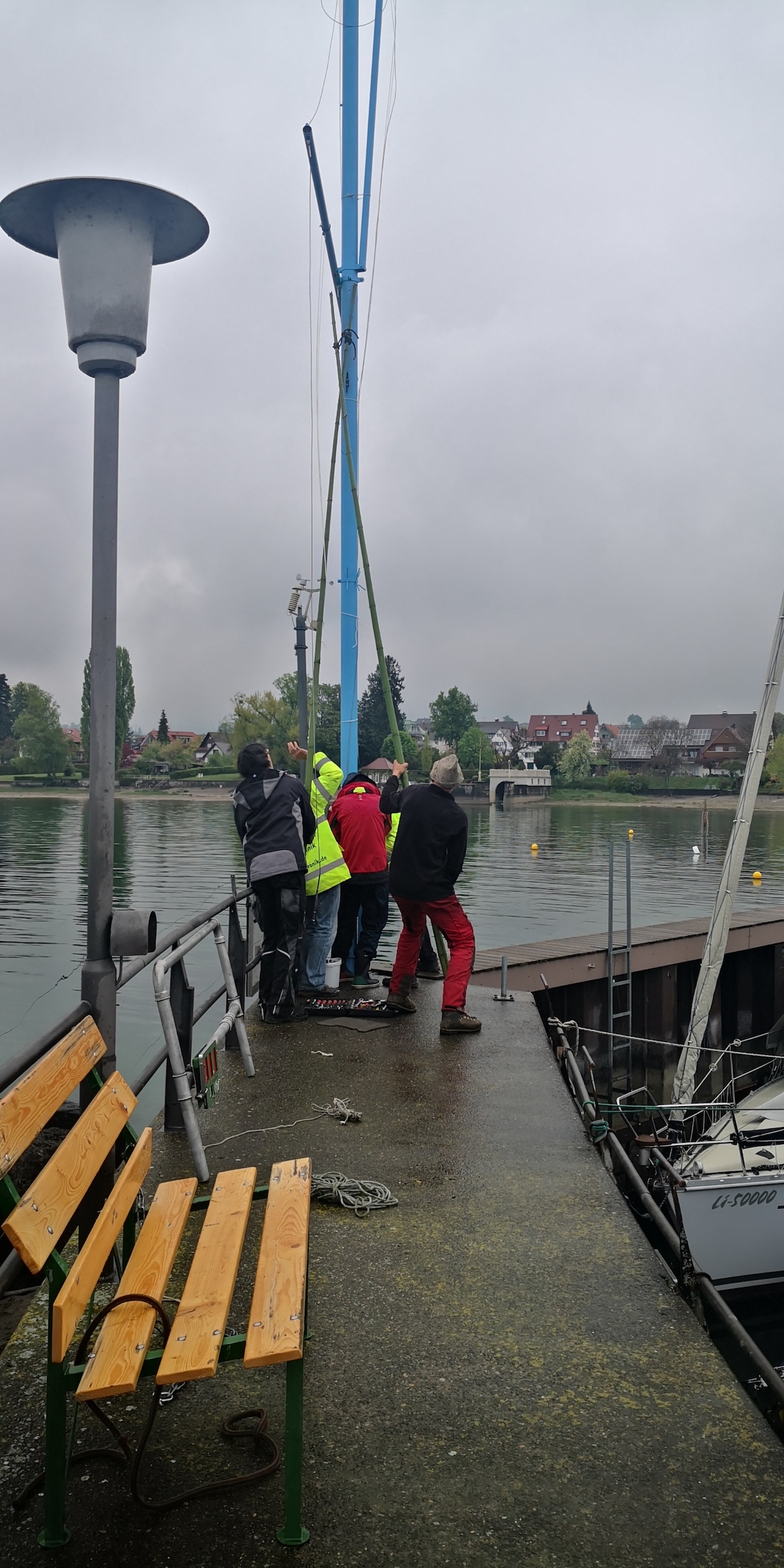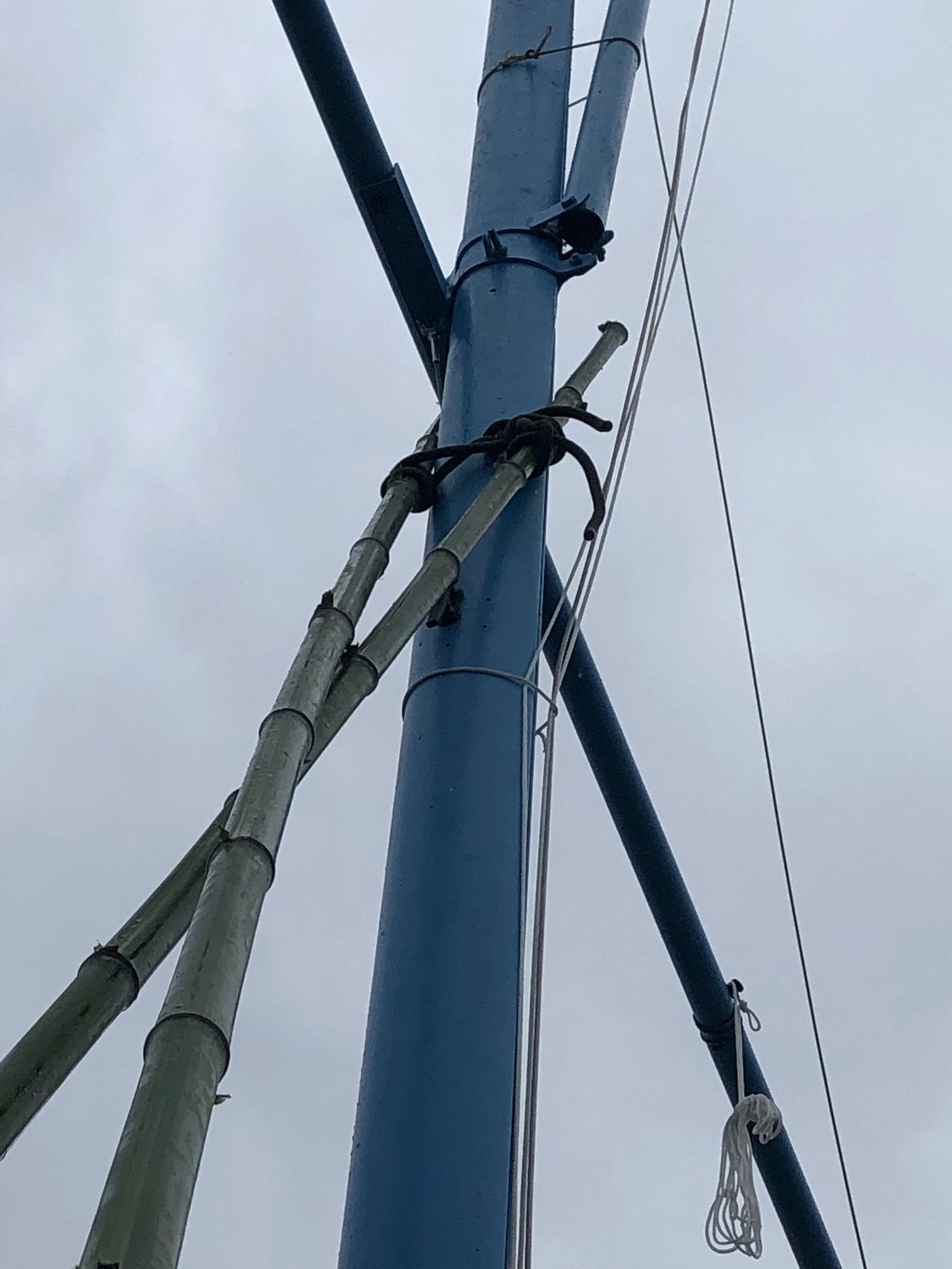 Für das Verfahren hatte Bernd Miller lange Bambusrohre mitgebracht, die er in Bad Schachen schneiden durfte. Dank der Stabilität dieser leichten Rohre und einer geschickten Anbringung gelang es, den Mast wieder zu stellen. Bernds Know-how als Kletterer war dann allerdings nochmals gefragt, als weitere Leinen verholt werden mussten. Jetzt freuen wir uns darauf, den Vereinsstander möglichst bald hissen zu dürfen.