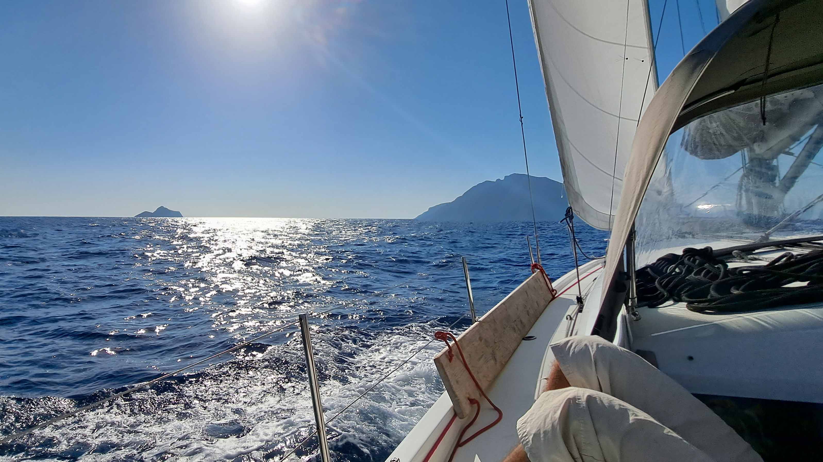Etappe 2 war die Überfahrt zur Insel Tilos. Ein kräftiger Wind machte den Seglern sichtlich Freude. Neben dem Hafen ließen wir die Anker fallen und verbrachten den lauen Abend an Bord. Aus nächster Nähe haben wir das Anlegen und Ablegen einer riesigen Fähre beobachten können.
