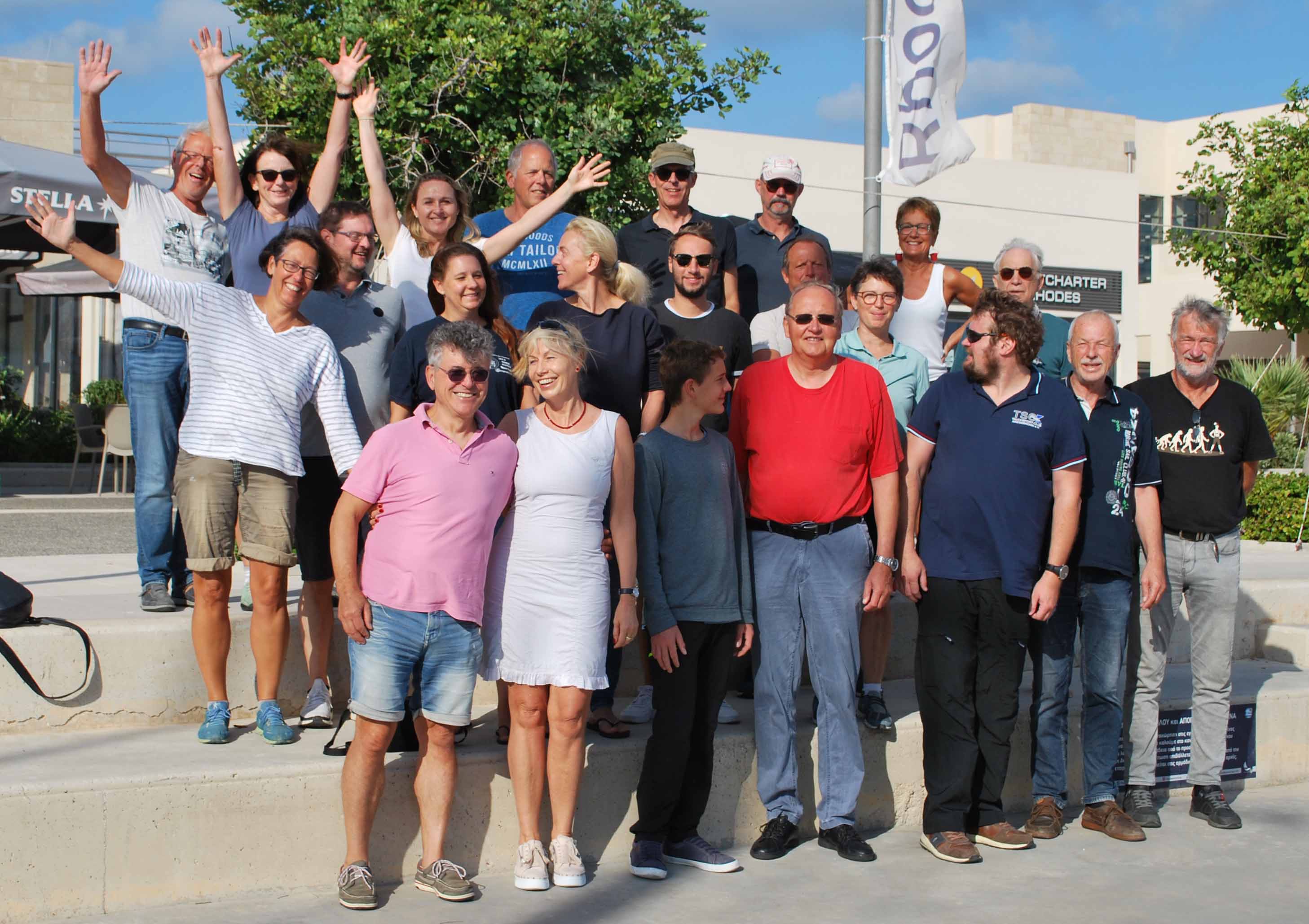 Diesmal ging es in die Südliche Ägäis, nach Rhodos. In der dortigen Marina trafen sich die 24 Seglerinnen und Segler bei herrlichem Sonnenschein zur Übernahme der drei Yachten. Nach ausreichender Beschaffung von Lebensmitteln und Getränken und einem gemeinsamen Abendessen im Fischrestaurant stachen die drei Skipper, Andreas Nagel (Vereinsvorsitzender), Roger Fackelmayer und Dietmar Rödel, mit ihren Crews am nächsten Morgen in See.
