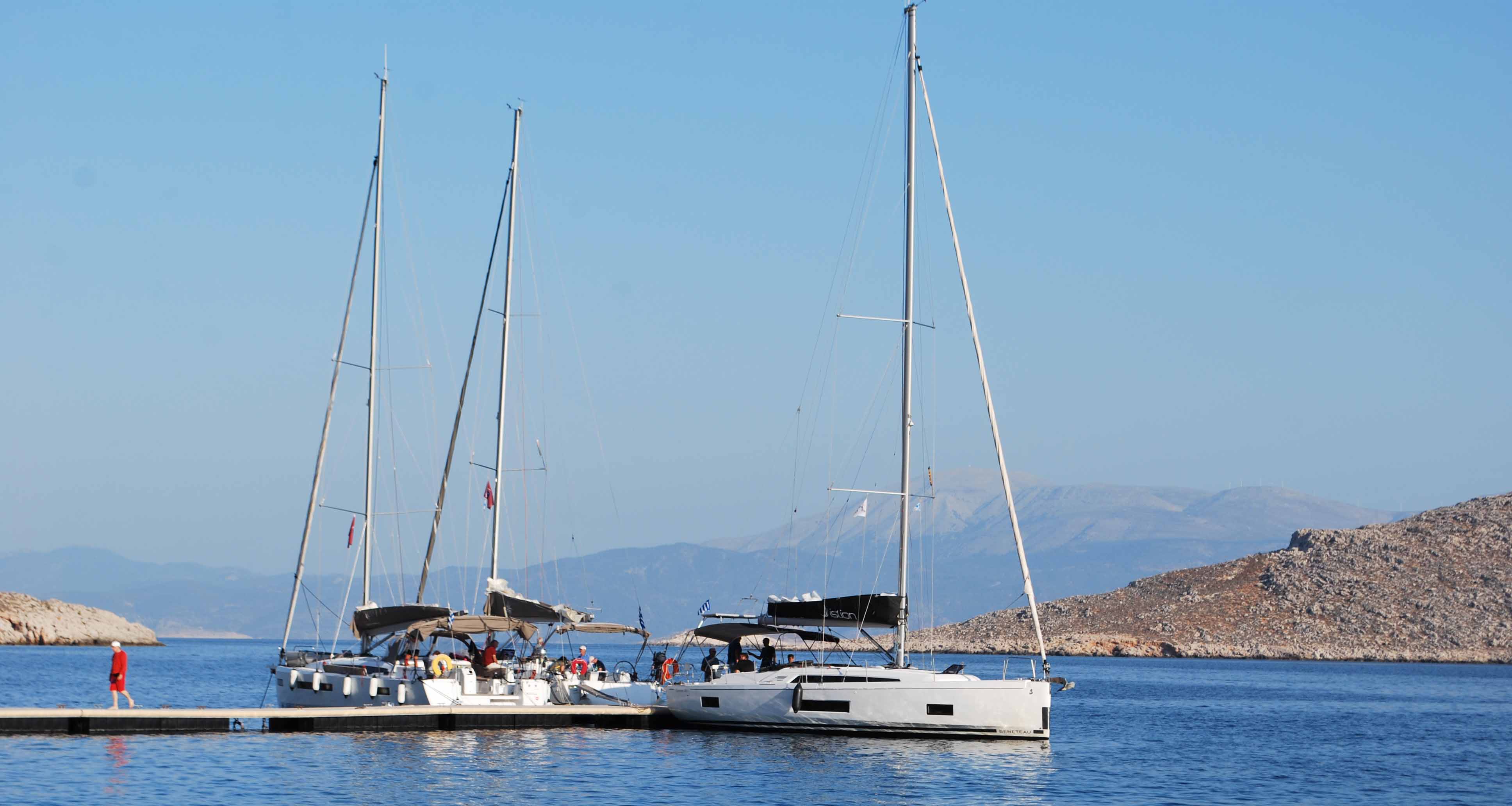 An Tag 3 wurde die Insel Chalki angesteuert. Am Schwimmsteg der Ortschaft Emborio, die sich malerisch, hufeisenförmig um den Hafen legt, machten wir fest. Nach einem ausgiebigen Landgang und einem gemeinsamen Abendessen wurde auf einem der Boote noch weiter gefeiert.