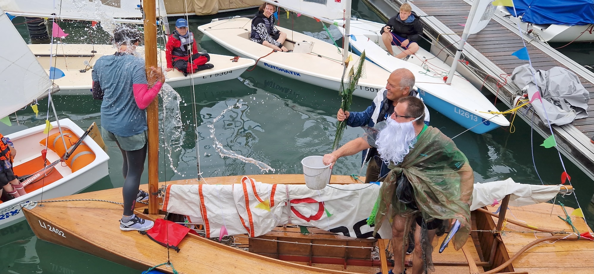 Der Hafen war festlich geschmückt, die meisten Boote über die Toppen geflaggt. Die Täuflinge hatten unterhalb des Anlegers festgemacht und lauschten Neptuns Reimen. Natürlich hatte Petrus nur deshalb den Regen vor Beginn der Bootstaufe eingestellt, um Neptun nicht die Schau zu stehlen. Denn auch diesmal ließ der Mann mit dem Dreizack auf die Reime ein paar Eimer Wasser folgen. Das erwischte alle Täuflinge und auch einen Teil der Vereinsmitglieder. Diese hatten die Bootstaufen vom Anleger aus mit den Signalhörnern ihrer Schiffe unüberhörbar begleitet.