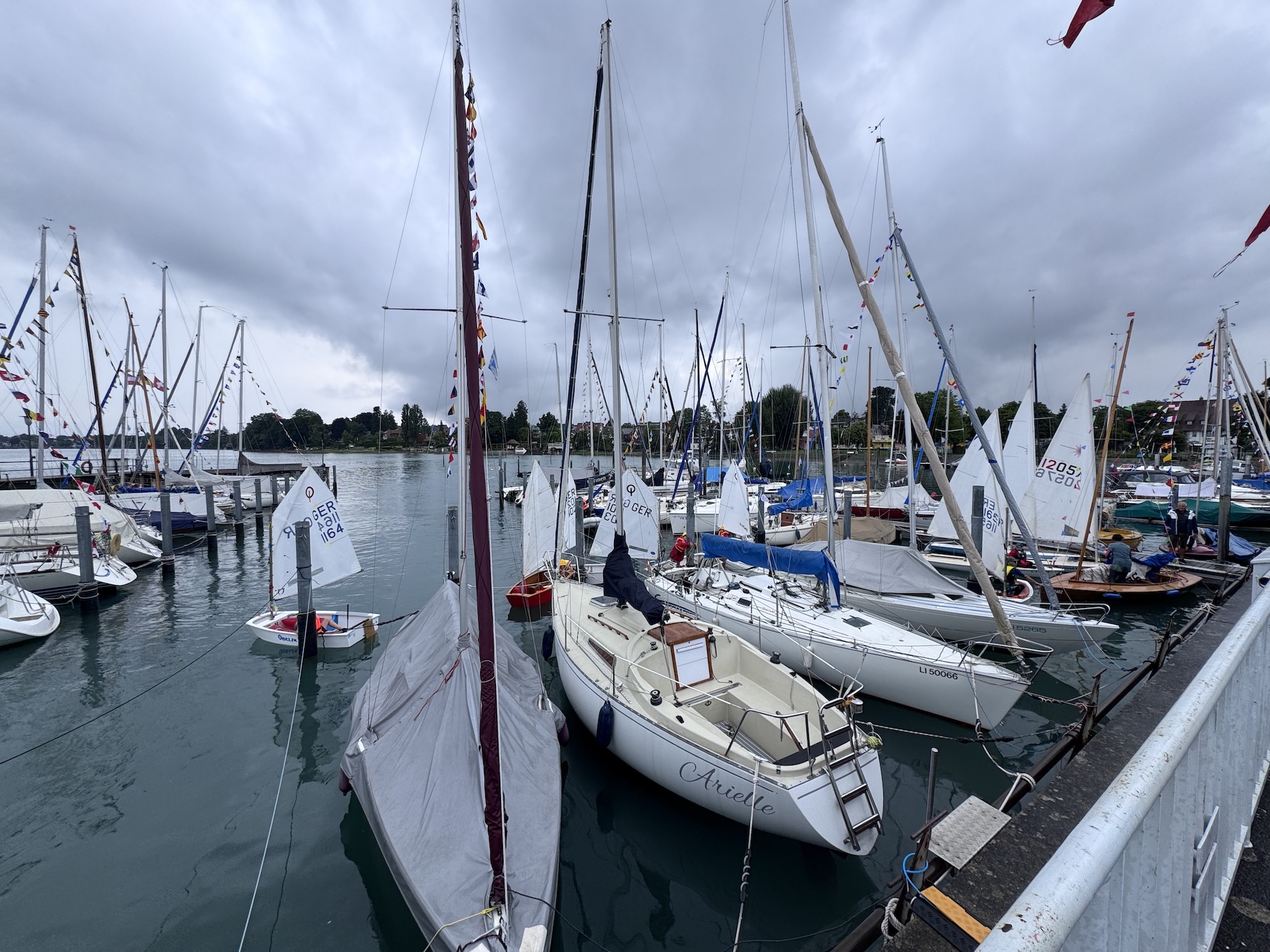 Als Petrus die Sintflut fortsetzte, saßen die Nonnenhorner Seglerinnen und Segler längst bei Kaltgetränken, Grillspezialitäten und Salaten in der leergeräumten Arbeitshalle am Winterlager. Und auch dieses „Sommerfest“ endete spät.